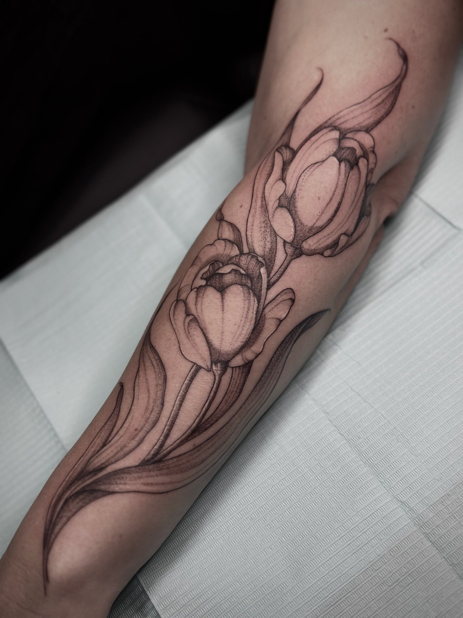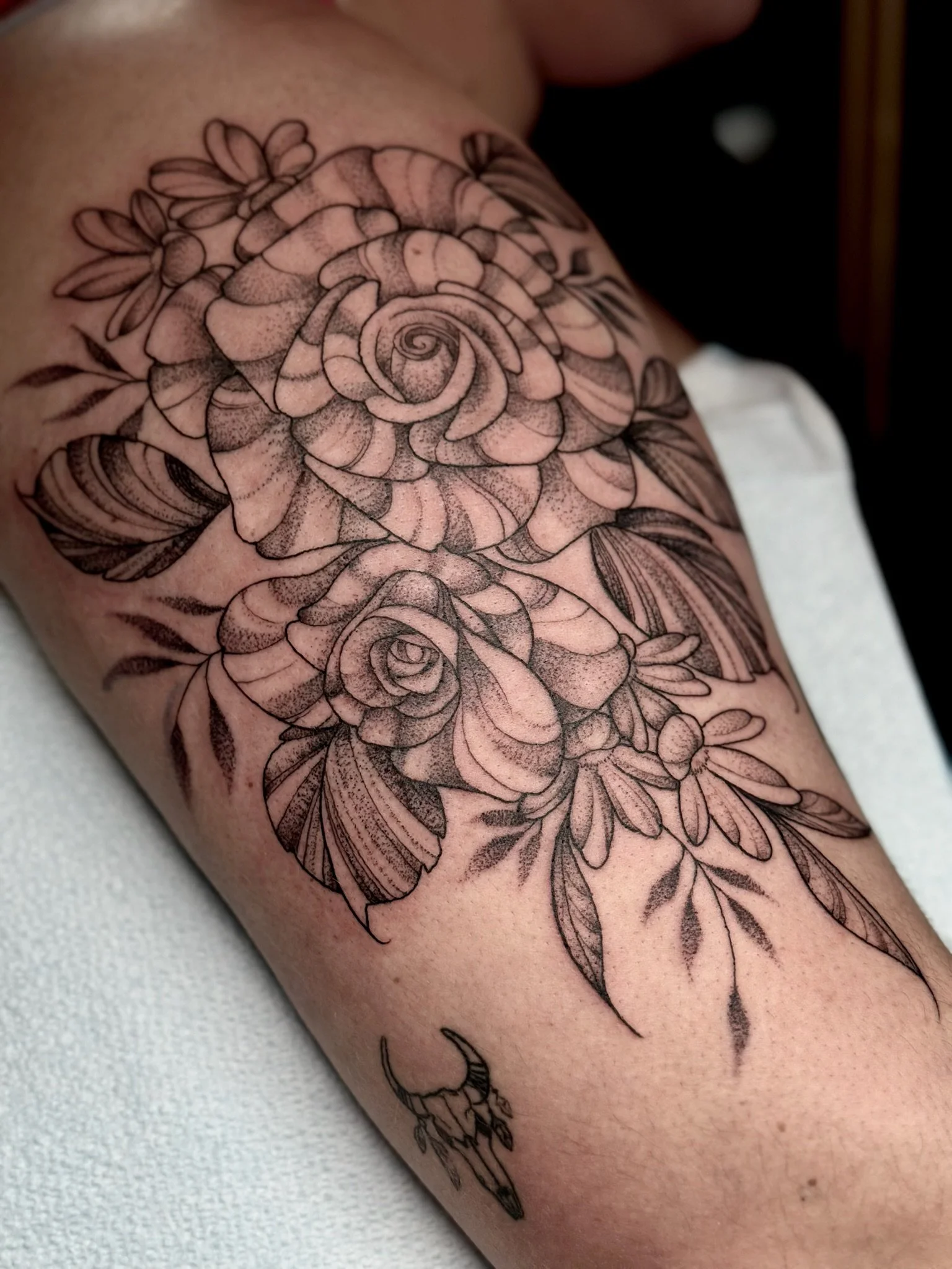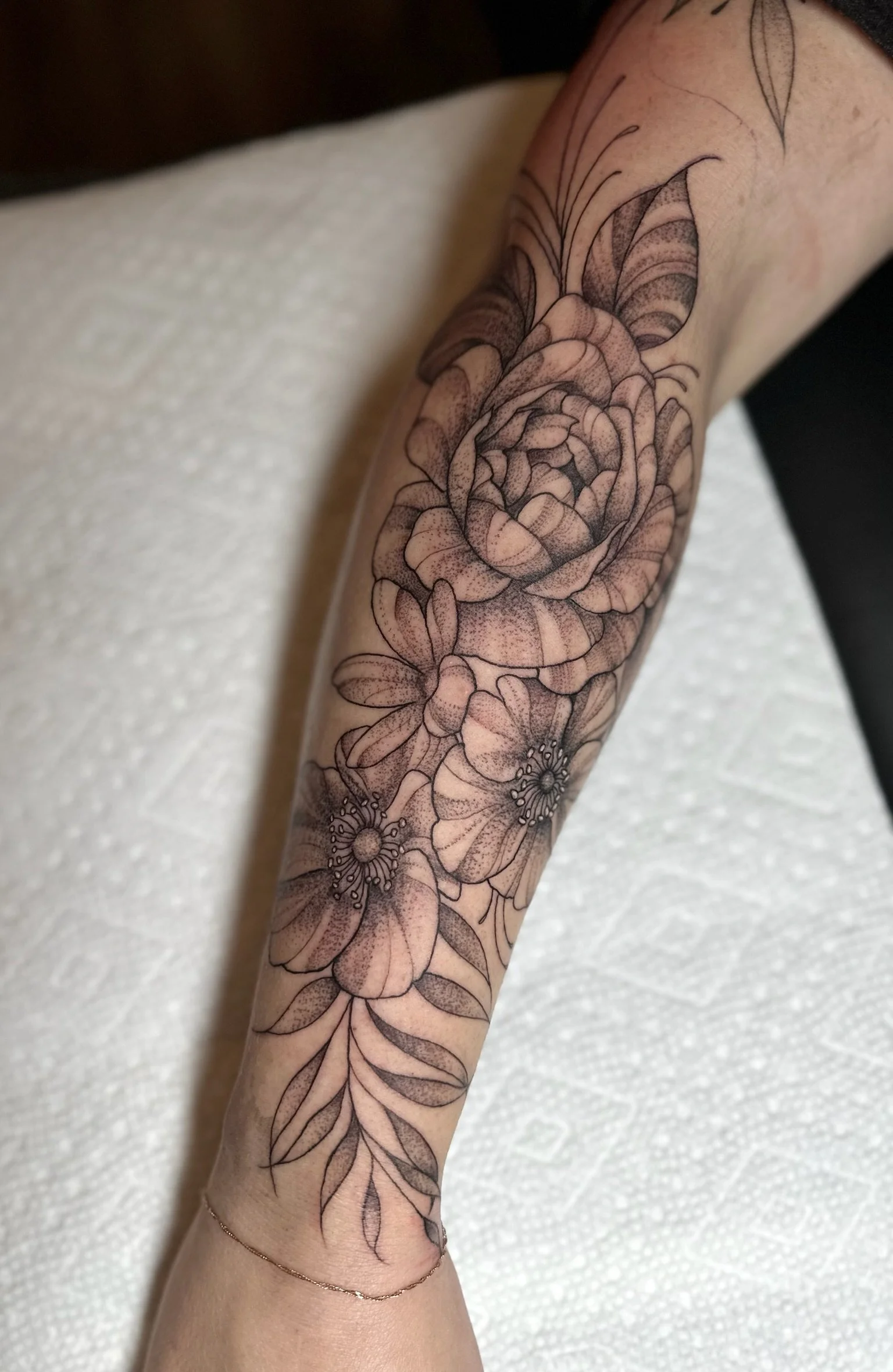 Kirsten specializes in black and grey work and is well known for her dainty, fine line florals. In the past year of her tattooing career, she has found great joy in focusing more on pet portrait work. Being a dog mom of two, she absolutely loves being able to provide her clients with beautiful portraits of their animals that they can carry with them forever. Kirsten also enjoys tattooing ornamental, script work, realism, traditional and more.
